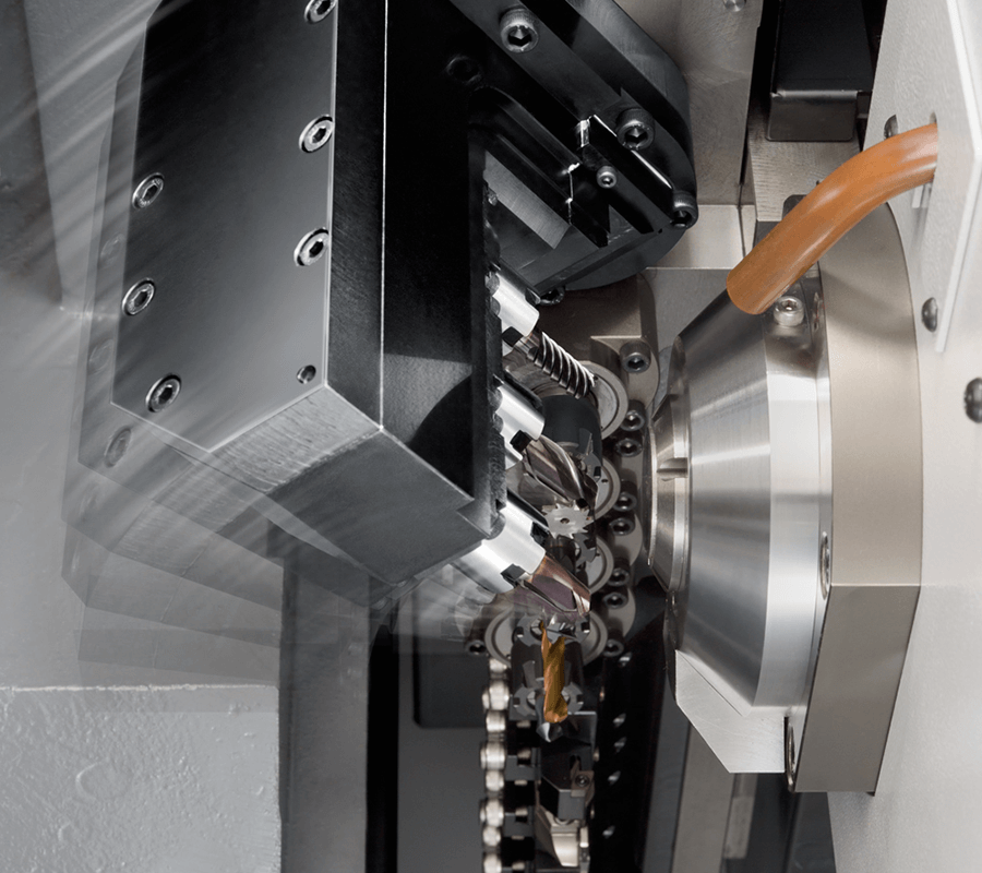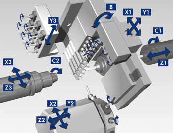 Ana Gang üzerinde yer alan B Eksen ve Arka Gang üzerinde yer alan Y2 Ekseni sayesinde ( (M32-VIII) çok takımlı ve çok yönlü işleme imkanı sağlanmıştır. Karmaşık şekilli parçaların işlenmesi yüksek adetteki takım bağlanabilmesi sayesinde artık çok kolaylaşmıştır.