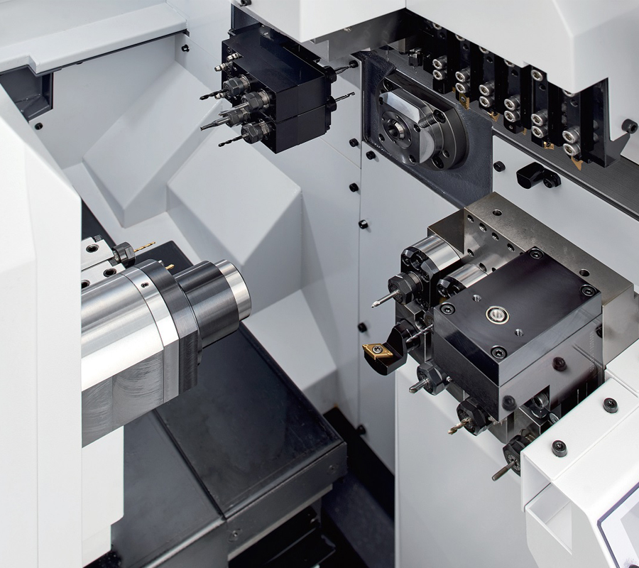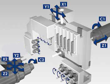L12-X modelinde karşı aynada Y Eksen mevcuttur. Karşı gang üzerine 4 sabit ve 4 canlı olmak üzere 8 adet takım bağlanabilmektedir. Ana Ayna daki 0-90 Açılandırılabilen deve boynu sayesinde açılı işlemler kolayca yapılabilmektedir. Ara yataklı ve ara yataksız kullanım kolaylığı sayesinde farklı parçaların işlenebilmesi için makine konfigürasyonu değiştirilebilmektedir. Tek bir yapıda iki farklı rol üstlenebilen bu kayar otomatta hem uzun hem de kısa parçalar verimli bir şekilde işlenebilmektedir.
